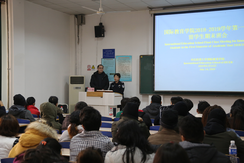 樊国平副院长用信任、尊重、制度这三个关键词勉励了在校留学生。冀芳烁老师和曲博老师分别对留学生在学习、保险、签证办理的事项的相关规定做了再次强调。留学生班主任详细向留学生介绍了人身安全、财产安全、消防安全、交通安全和网络安全相关知识。最后,何懿副院长做了总结,希望大家在中国度过一个愉快的假期。