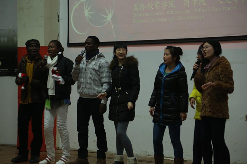 联欢会上,中外学生表演了奔放的现代舞、特色的民族乐器、诙谐幽默的小品和气氛热烈的游戏,中外学子共同演唱的歌曲《相亲相爱的一家人》把联欢会推向了高潮。