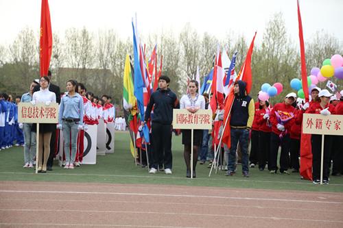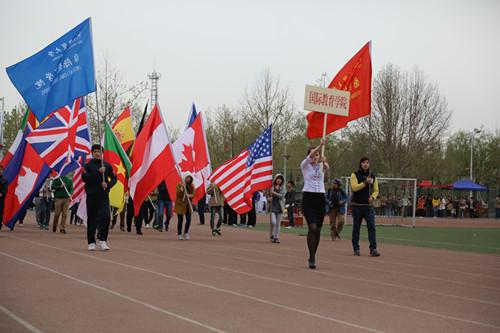 4月18日,欧美av 组织留学生以国旗方阵的形式参加了 欧美av 第十八届田径校运动会开幕式。由28面各国国旗组成的国旗方阵,代表了 欧美av 1990年开展留学生教育以来,曾在 欧美av 学习过的来自喀麦隆、韩国等28个国家的千余名留学生。独具特色的国旗方阵给在场的所有人留下深刻的印象;留学生整齐的步伐,良好的精神风貌,成为校运动会开幕式上一道靓丽的风景。