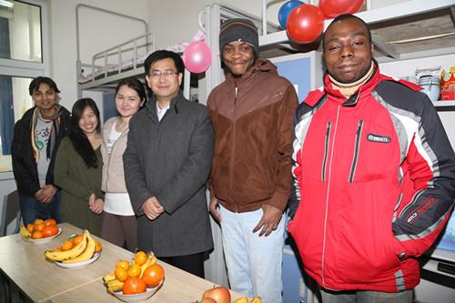 2013年2月17日,校党委常委陈亮代表学校到留学生公寓看望慰问了寒假驻校的外国留学生并送去了春节慰问品。陈亮向留学生介绍了中国春节的传统习俗,对留学生们表达了新春的祝福,祝愿大家在新学期学习进步,生活顺利。来自俄罗斯、印度尼西亚、韩国、喀麦隆、尼日利亚等国家的寒假驻校留学生感谢校领导的热情关怀,纷纷表示他们在经贸大学学习和生活都很愉快,他们将努力取得更好的学习成绩。